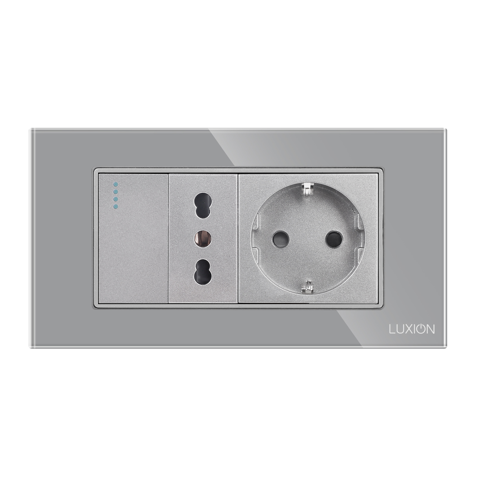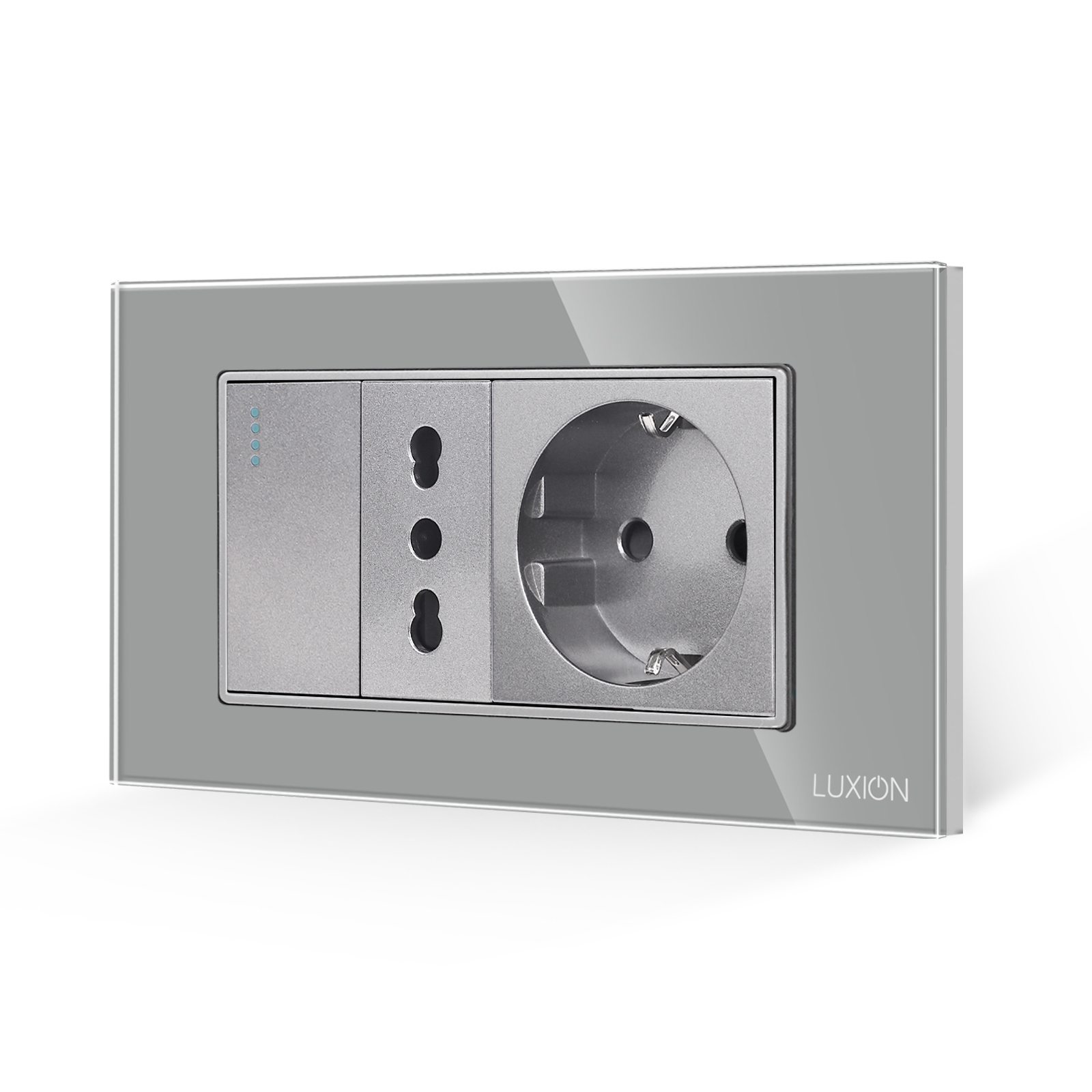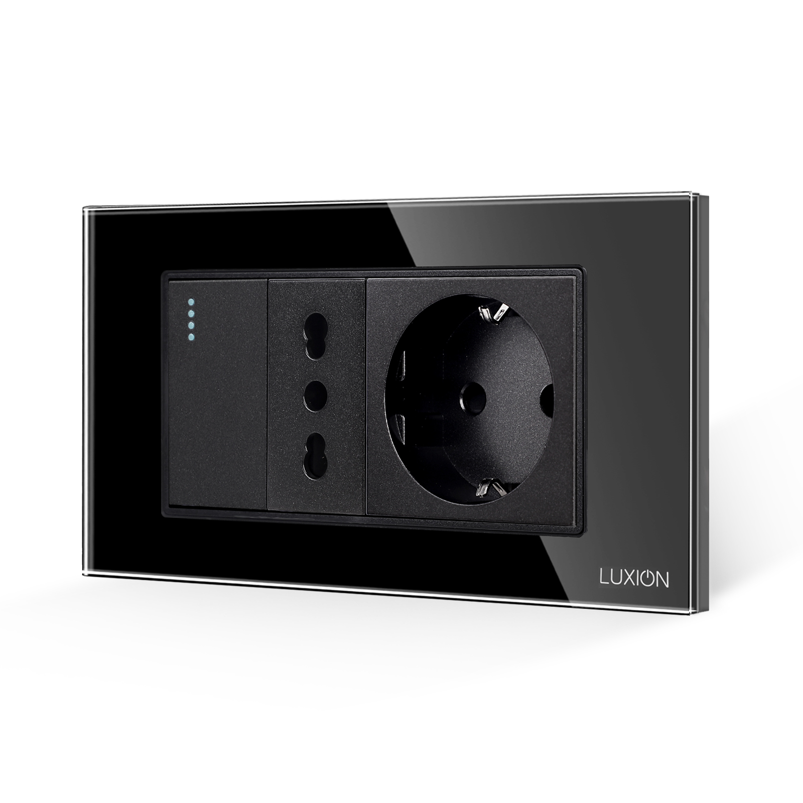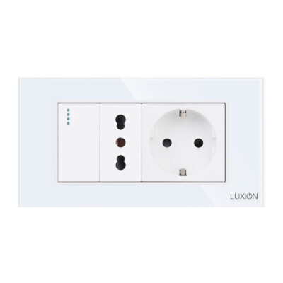 Intrerupator simplu + priza ingusta + priza schuko cu rama din sticla Luxion, standard Italian, 4M - solutia ideala pentru casa sau spatiul tau. Bucura-te de un design rafinat si functional, cu atentie la detalii. LUXION se integreaza perfect in orice mediu. Astfel poate fi montat nu doar in casa, ci si in spatii precum: birouri si spatii comerciale, spatii HoReCa, showroom-uri si sali de prezentare, depozite si spatii industriale moderne, cladiri rezidentiale sau de birouri.